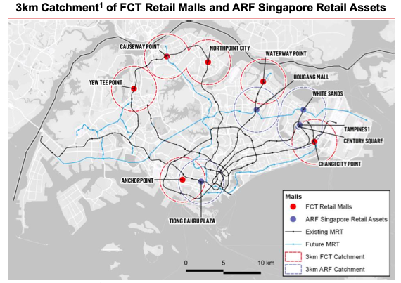What interested me is the two maps which were shared in the abovementioned presentation slides, which showed the catchment area (or “location of influence” in my write up here) of the malls (Figure 1) and their proximity to the MRT stations (or “location of complements” in the same said write up) (Figure 2). I had just written a piece about FCT a while back here where I had described them as the King of the North. With the full acquisition of the ARF properties, FCT is poised to have a huge retail influence and foothold not just the population centres in the north, but in the north-east and east, too.